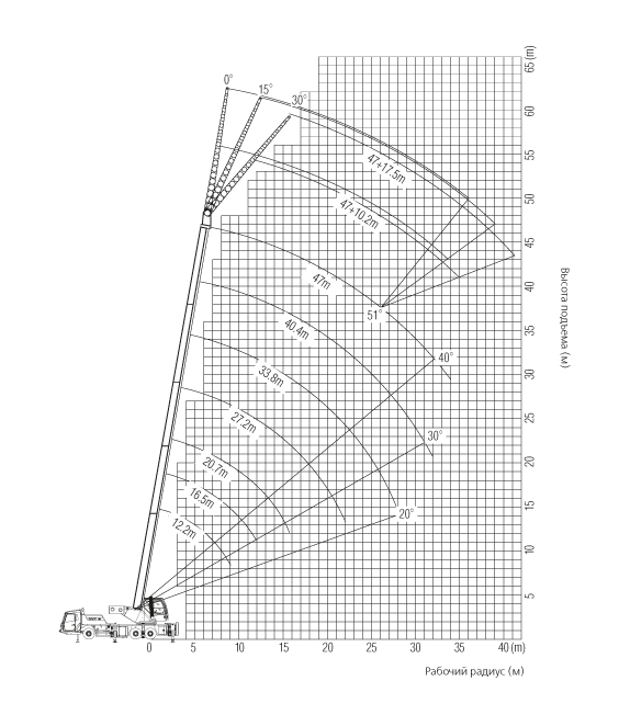| Базовая стрела Полностью выдвинутая стрела Полностью выдвинутая стрела + гусек | 12,2 м 47 м 64,5 м |